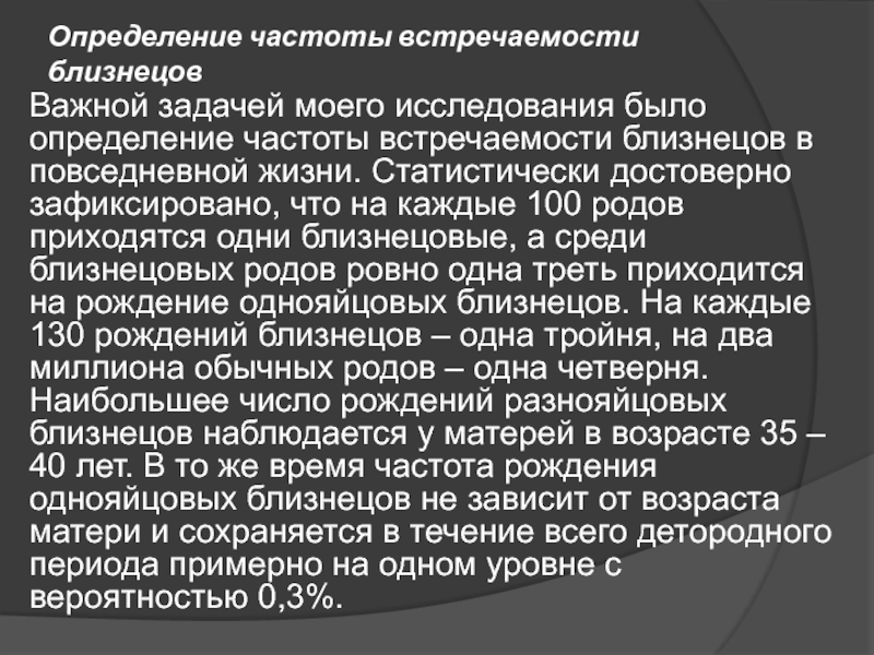 близнецов в повседневной жизни. Статистически достоверно зафиксировано, что на каждые 100 родов приходятся одни близнецовые, а среди близнецовых родов ровно одна треть приходится на рождение однояйцовых близнецов. На каждые 130 рождений близнецов – одна тройня, на два миллиона обычных родов – одна четверня. Наибольшее число рождений разнояйцовых близнецов наблюдается у матерей в возрасте 35 – 40 лет. В то же время частота рождения однояйцовых близнецов не зависит от возраста матери и сохраняется в течение всего детородного периода примерно на одном уровне с вероятностью 0,3%.