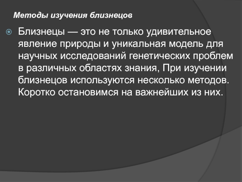 уникальная модель для научных исследований генетических проблем в различных областях знания, При изучении близнецов используются несколько методов. Коротко остановимся на важнейших из них.