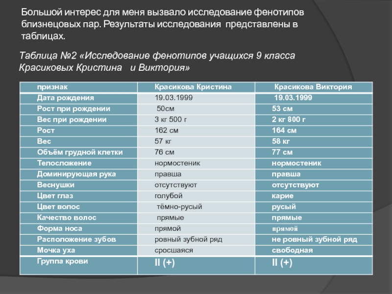 Слайд 23Большой интерес для меня вызвало исследование фенотипов близнецовых пар. Результаты исследования