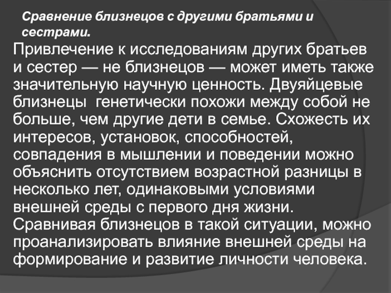 Слайд 17Сравнение близнецов с другими братьями и сестрами.