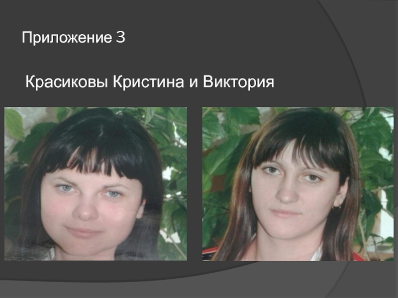 большее количество признаков совпадает, тем больше вероятность, что это однояйцевые близнецы. Пары однояйцевых близнецов почти в 100% случаев имеют одинаковый цвет волос и глаз и одинаковую форму губ. Однако и более 60% пар двуяйцевых близнецов имеют совершенно похожую форму губ, около 20—30%— одинаковый цвет глаз и примерно 10—20% — одинаковый цвет волос. Исследования фенотипов данных пар близнецов показало, что степень конкордантности близнецовой пары Поповых больше, чем Красиковых, которые имеют отличия по нескольким наследственным признакам. Следовательно, по предварительным прогнозам, близнецов Красиковых можно отнести к дизиготным, т.е. двуяйцевым близнецам, а близнецовая пара Поповых является монозиготной.