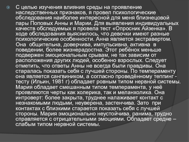 психологические обследования наиболее интересной для меня близнецовой пары Поповых Анны и Марии. Для выявления индивидуальных качеств обследуемых я провела тест «Опросник Айзенка». В ходе обследования выяснилось, что девочки имеют разные психологические особенности. Анна является экстравертом. Она общительна, доверчива, импульсивна, активна в поведении, более жизнерадостна. Этот ребёнок меньше подвержен эмоциональным срывам, не так зависим от расположения других людей, особенно взрослых. Следует отметить, что ответы Анны не всегда были правдивы. Она старалась показать себя с лучшей стороны. По темпераменту она является сангвиником, а согласно проведённому теппинг - тесту (Ильин, 1981 г) обладает ровным типом нервной системы. Мария обладает смешанным типом темперамента, у неё проявляются черты как холерика, так и меланхолика. Она интроверт: более закрыта, труднее налаживает контакт с незнакомыми людьми, неуверена, застенчива. Зато при контактах с близкими старается показать себя с лучшей стороны. Мария эмоционально неустойчива, ранима, трудно справляется с отрицательными эмоциями. Обладает средне – слабым типом нервной системы.