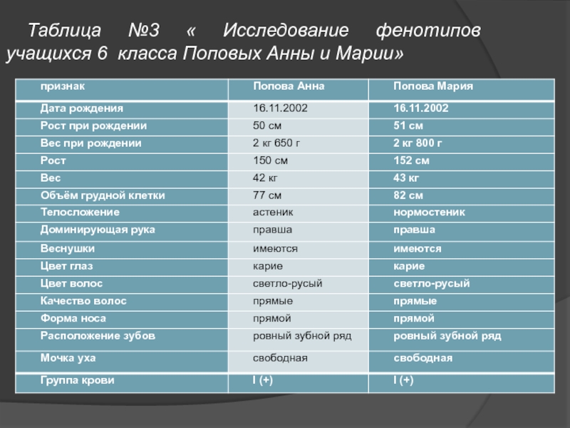 Слайд 24Таблица №3 « Исследование фенотипов учащихся 6 класса Поповых Анны и