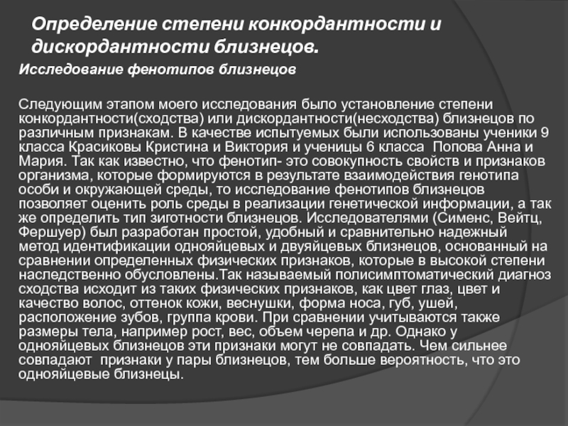 было установление степени конкордантности(сходства) или дискордантности(несходства) близнецов по различным признакам. В качестве испытуемых были использованы ученики 9 класса Красиковы Кристина и Виктория и ученицы 6 класса Попова Анна и Мария. Так как известно, что фенотип- это совокупность свойств и признаков организма, которые формируются в результате взаимодействия генотипа особи и окружающей среды, то исследование фенотипов близнецов позволяет оценить роль среды в реализации генетической информации, а так же определить тип зиготности близнецов. Исследователями (Сименс, Вейтц, Фершуер) был разработан простой, удобный и сравнительно надежный метод идентификации однояйцевых и двуяйцевых близнецов, основанный на сравнении определенных физических признаков, которые в высокой степени наследственно обусловлены.Так называемый полисимптоматический диагноз сходства исходит из таких физических признаков, как цвет глаз, цвет и качество волос, оттенок кожи, веснушки, форма носа, губ, ушей, расположение зубов, группа крови. При сравнении учитываются также размеры тела, например рост, вес, объем черепа и др. Однако у однояйцевых близнецов эти признаки могут не совпадать. Чем сильнее совпадают признаки у пары близнецов, тем больше вероятность, что это однояйцевые близнецы.
