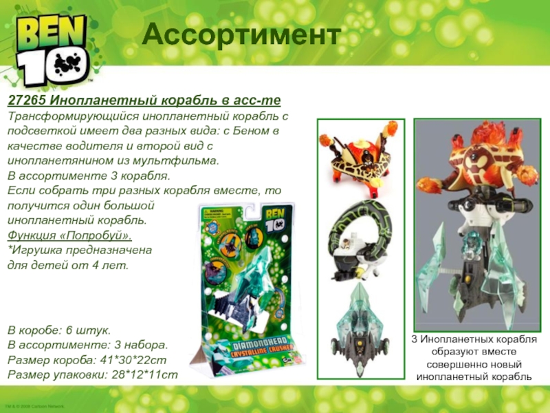 Лаборатория позволяет поиграть с инопланетными существами, создать их при помощи пластилина в прилагаемых формах и из двух инопланетных камней, позволяет просмотреть три анимационных диска (можно просматривать диски, которые идут в наборе с фигуркой 10см арт. 27200 или с часами арт. 27280).