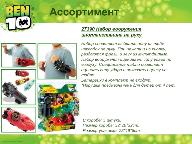 Набор позволяет выбрать одну из трёх накладок на руку. При нажатии на кнопку, раздаются фразы и звук из мультфильма.