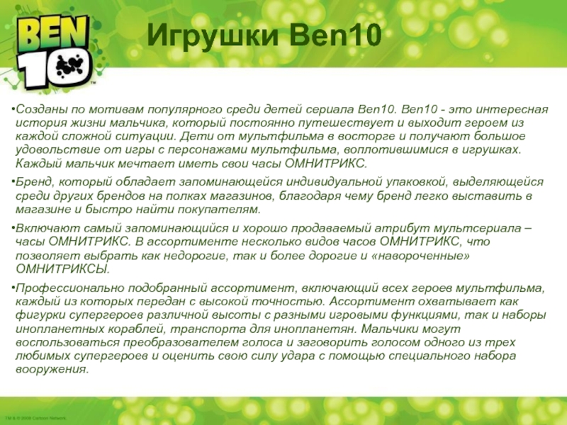 Часы являются основным атрибутом Бена. Яркие и впечатляющие Часы на батарейках со светом и звуком позволяют выбрать на циферблате супергероя и активировать звук из мультфильма. При выборе супергероя он начинает светиться.
