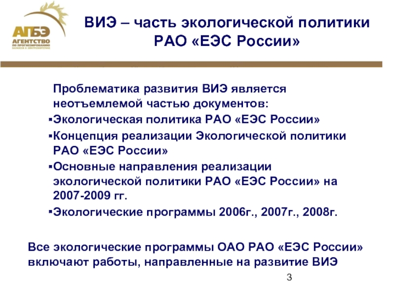Все экологические программы ОАО РАО «ЕЭС России» включают работы, направленные на развитие ВИЭ