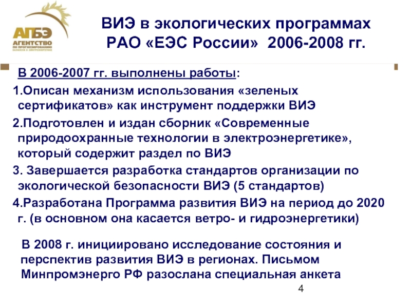 В 2008 г. инициировано исследование состояния и перспектив развития ВИЭ в регионах. Письмом Минпромэнерго РФ разослана специальная анкета
