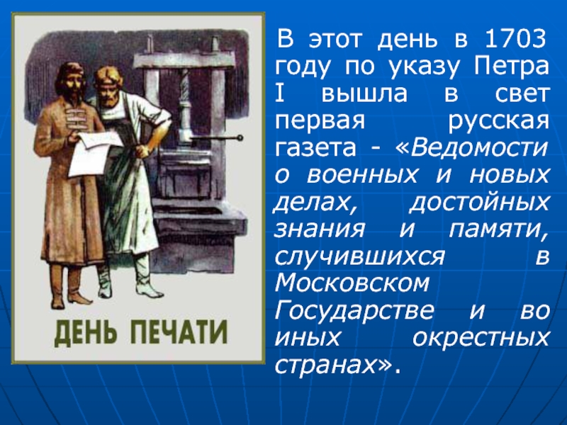 вышла в свет первая русская газета - «Ведомости о военных и новых делах, достойных знания и памяти, случившихся в Московском Государстве и во иных окрестных странах».