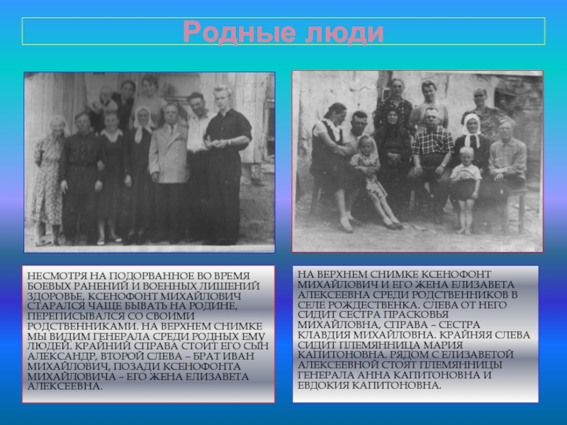 НА ВЕРХНЕМ СНИМКЕ КСЕНОФОНТ МИХАЙЛОВИЧ И ЕГО ЖЕНА ЕЛИЗАВЕТА АЛЕКСЕЕВНА СРЕДИ РОДСТВЕННИКОВ В СЕЛЕ РОЖДЕСТВЕНКА. СЛЕВА ОТ НЕГО СИДИТ СЕСТРА ПРАСКОВЬЯ МИХАЙЛОВНА, СПРАВА – СЕСТРА КЛАВДИЯ МИХАЙЛОВНА. КРАЙНЯЯ СЛЕВА СИДИТ ПЛЕМЯННИЦА МАРИЯ КАПИТОНОВНА. РЯДОМ С ЕЛИЗАВЕТОЙ АЛЕКСЕЕВНОЙ СТОЯТ ПЛЕМЯННИЦЫ ГЕНЕРАЛА АННА КАПИТОНОВНА И ЕВДОКИЯ КАПИТОНОВНА.