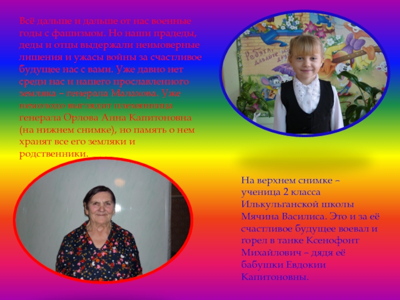 На верхнем снимке – ученица 2 класса Илькульганской школы Мячина Василиса. Это и за её счастливое будущее воевал и горел в танке Ксенофонт Михайлович – дядя её бабушки Евдокии Капитоновны.
