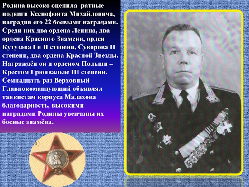 Наш генерал, будучи на пенсии, продолжал вести кипучую общественную деятельность. Он постоянно интересовался жизнью и проблемами земляков, поддерживал с ними связь. Например, здание деревянной школы в селе Рождественка было построено при большом содействии Ксенофонта Михайловича