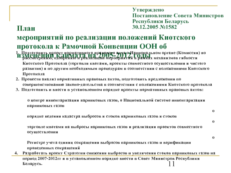 1. Подготовить проект нормативного правового акта о Национальном органе (Комиссии) по рассмотрению, одобрению и реализации мероприятий в рамках механизмов гибкости Киотского Протокола (торговля квотами, проекты совместного осуществления и чистого развития) и по другим необходимым процедурам в соответствии с положениями Киотского Протокола