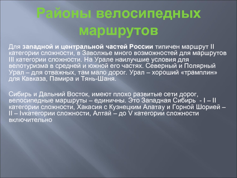Сибирь и Дальний Восток, имеют плохо развитые сети дорог, велосипедные маршруты – единичны. Это Западная Сибирь - I – II категории сложности, Хакасия с Кузнецким Алатау и Горной Шорией – II – Ivкатегории сложности, Алтай – до V категории сложности включительно