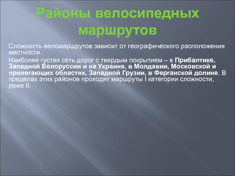 сеть дорог с твердым покрытием – в Прибалтике, Западной Белоруссии и на Украине, в Молдавии, Московской и прилегающих областях, Западной Грузии, в Ферганской долине. В пределах этих районов проходят маршруты I категории сложности, реже II.
