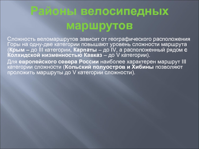 категории повышают уровень сложности маршрута (Крым – до III категории, Карпаты – до IV, а расположенный рядом с Колхидской низменностью Кавказ – до V категории).