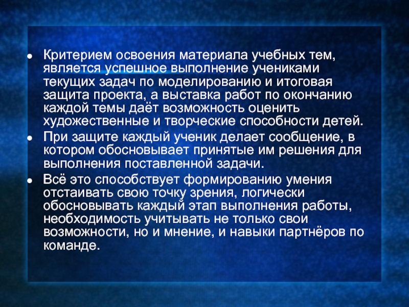 Всё это способствует формированию умения отстаивать свою точку зрения, логически обосновывать каждый этап выполнения работы, необходимость учитывать не только свои возможности, но и мнение, и навыки партнёров по команде.