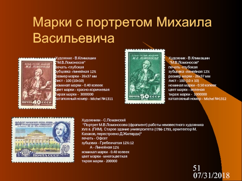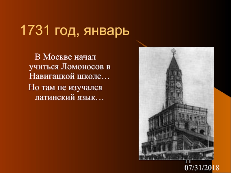 "Портрет М.В.Ломоносова (фрагмент) работы неизвестного художника XVII в. (ГИМ). Старое здание университета (!786-1793, архитектор М.Казаков, перестроено Д.Жилярди)"