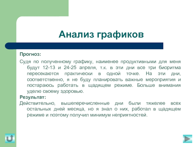 12-13 и 24-25 апреля, т.к. в эти дни все три биоритма пересекаются практически в одной точке. На эти дни, соответственно, я не буду планировать важные мероприятия и постараюсь работать в щадящем режиме. Больше внимания уделю своему здоровью.