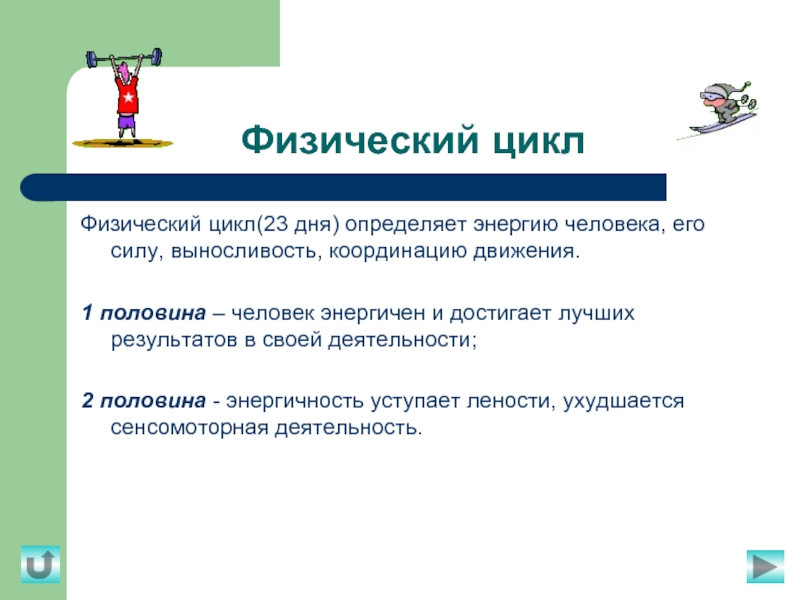 Физический цикл(23 дня) определяет энергию человека, его силу, выносливость, координацию