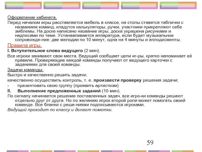 таблички с названием команд, кладутся калькуляторы, ручки, участники прикрепляют себе эмблемы. На доске написано название игры, доска украшена рисунками и надписями по теме. Устанавливается аппаратура, если будет музыкальное сопровождение: две мелодии по 10 минут, одна на 4 минуты и аплодисменты.