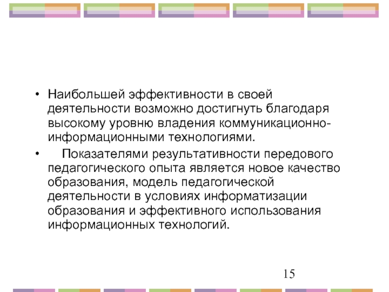 Показателями результативности передового педагогического опыта является новое качество образования, модель педагогической деятельности в условиях информатизации образования и эффективного использования информационных технологий.