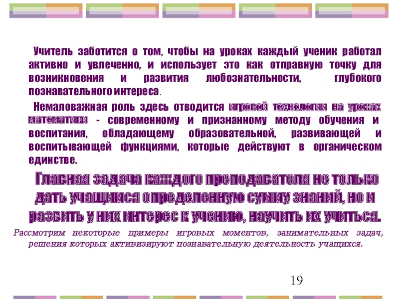 Слайд 19 Учитель заботится о том, чтобы на уроках каждый ученик работал активно