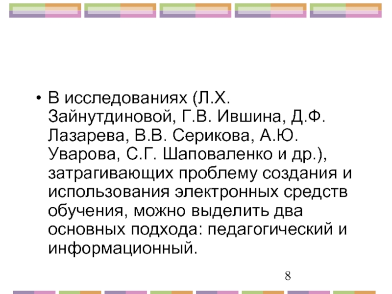 Уварова, С.Г. Шаповаленко и др.), затрагивающих проблему создания и использования электронных средств обучения, можно выделить два основных подхода: педагогический и информационный.