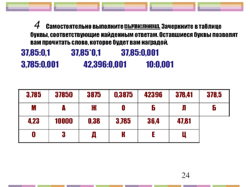 Слайд 24 4 Самостоятельно выполните вычисления. Зачеркните в таблице буквы, соответствующие найденным ответам. Оставшиеся