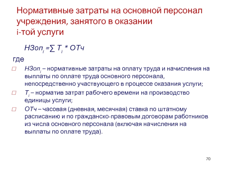 НЗопi – нормативные затраты на оплату труда и начисления на выплаты по оплате труда основного персонала, непосредственно участвующего в процессе оказания услуги;