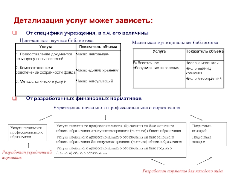 (оценка потребности в услугах; связь с реестром расходных обязательств; определение натуральных и финансовых нормативов; связь с целями и задачами ОИВ и т.д.)