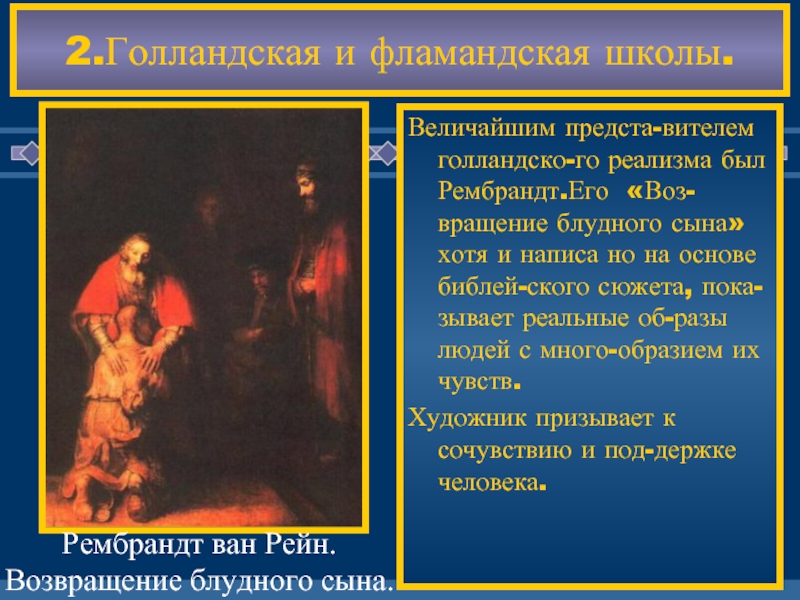 Величайшим предста-вителем голландско-го реализма был Рембрандт.Его «Воз-вращение блудного сына» хотя и написа но на основе библей-ского сюжета, пока-зывает реальные об-разы людей с много-образием их чувств.