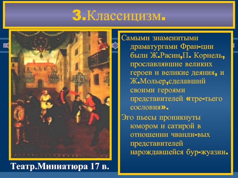 Самыми знаменитыми драматургами Фран-ции были Ж.Расин,П. Корнель,прославлявшие великих героев и великие деяния, и Ж.Мольер,сделавший своими героями представителей «тре-тьего сословия».