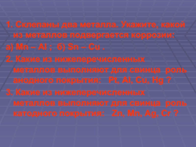 Слайд 191. Склепаны два металла. Укажите, какой из металлов подвергается коррозии: