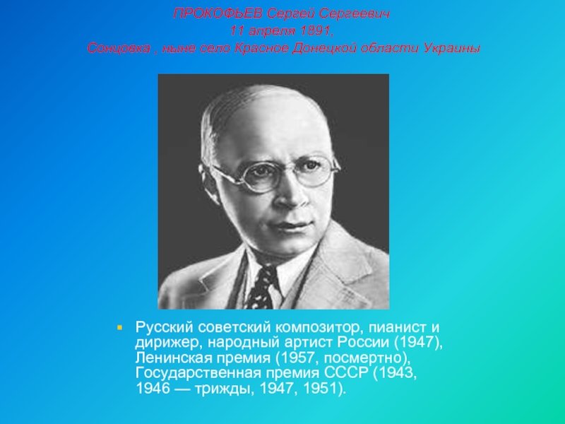 Русский советский композитор, пианист и дирижер, народный артист России (1947), Ленинская премия (1957, посмертно), Государственная премия СССР (1943, 1946 — трижды, 1947, 1951).