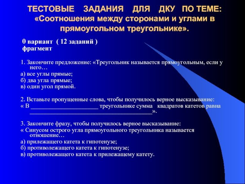 1. Закончите предложение: «Треугольник называется прямоугольным, если у него…