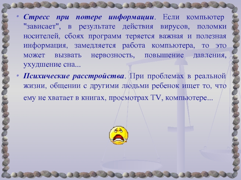 поломки носителей, сбоях программ теряется важная и полезная информация, замедляется работа компьютера, то это может вызвать нервозность, повышение давления, ухудшение сна...