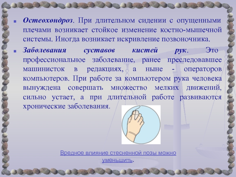 Слайд 18Остеохондроз. При длительном сидении с опущенными плечами возникает стойкое изменение костно-мышечной