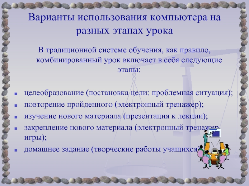 Слайд 11Варианты использования компьютера на разных этапах урока