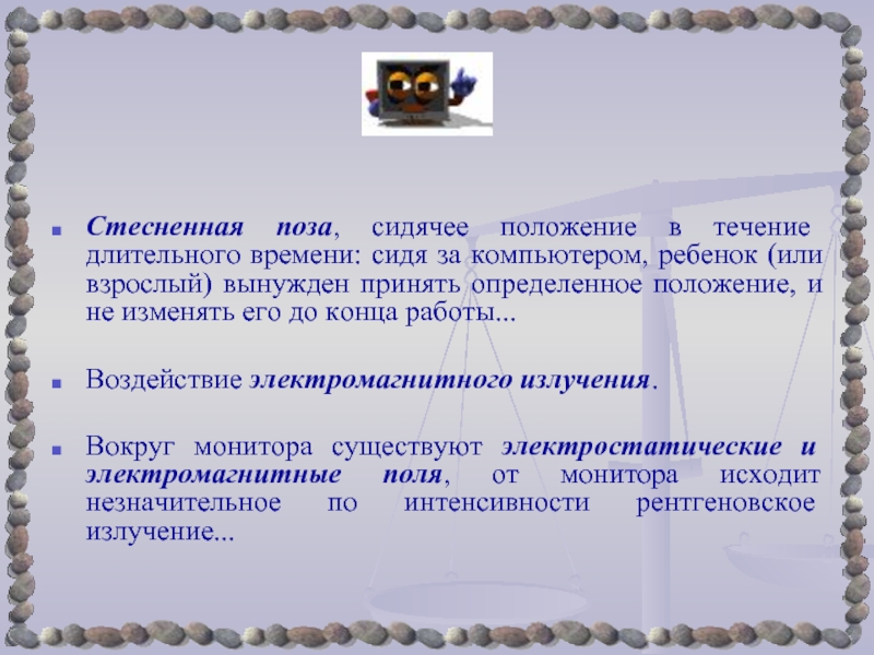 Слайд 13Стесненная поза, сидячее положение в течение длительного времени: сидя за компьютером,