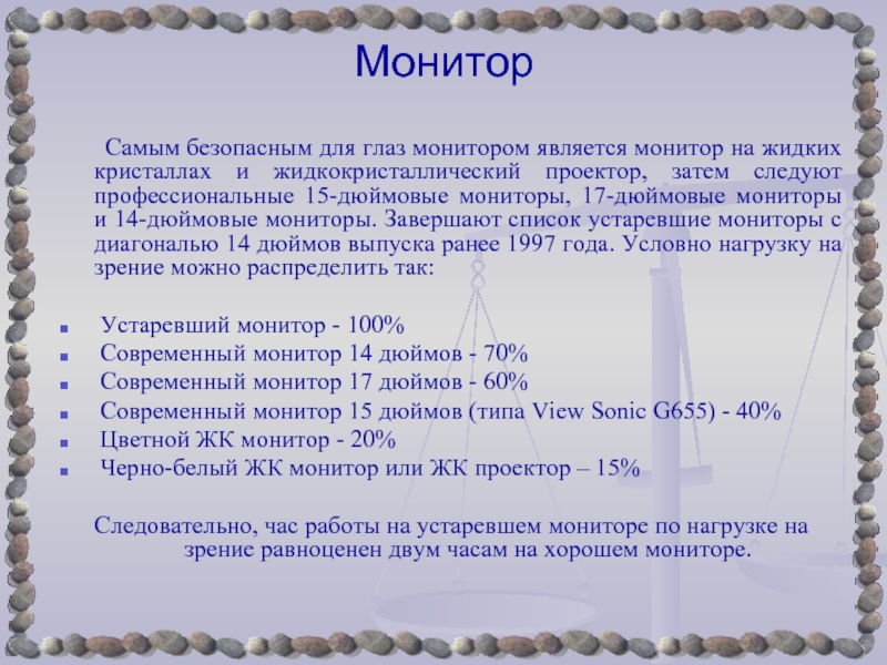 жидкокристаллический проектор, затем следуют профессиональные 15-дюймовые мониторы, 17-дюймовые мониторы и 14-дюймовые мониторы. Завершают список устаревшие мониторы с диагональю 14 дюймов выпуска ранее 1997 года. Условно нагрузку на зрение можно распределить так: