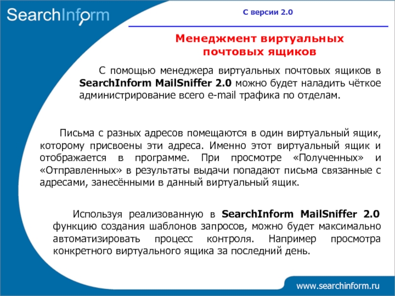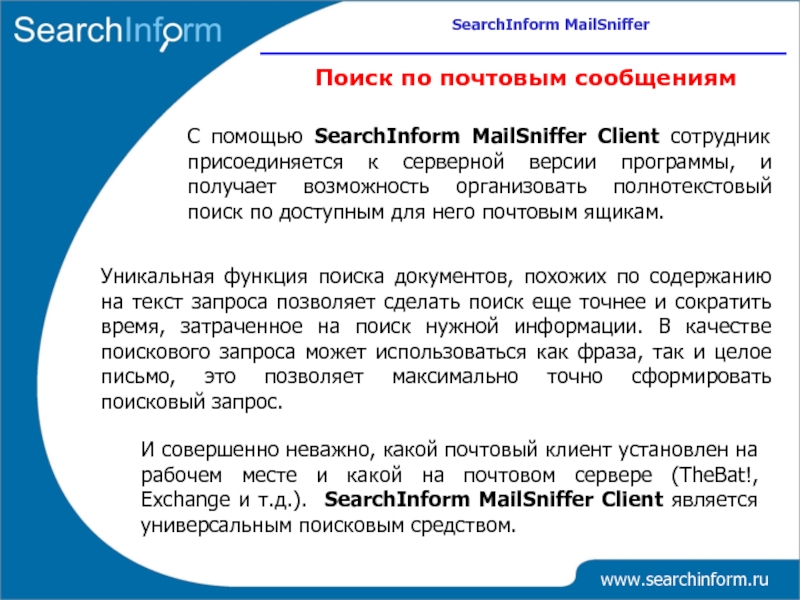 И совершенно неважно, какой почтовый клиент установлен на рабочем месте и какой на почтовом сервере (TheBat!, Exchange и т.д.). SearchInform MailSniffer Client является универсальным поисковым средством.