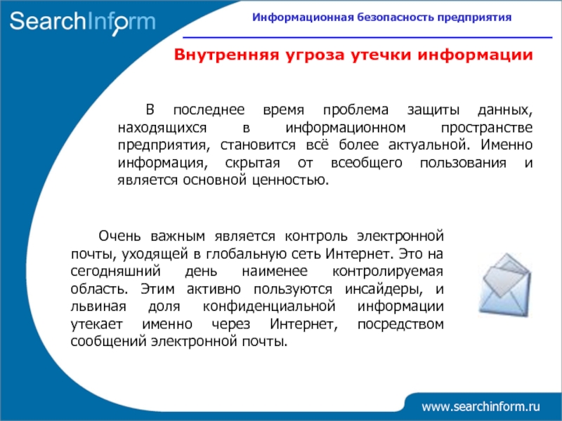 Очень важным является контроль электронной почты, уходящей в глобальную сеть Интернет. Это на сегодняшний день наименее контролируемая область. Этим активно пользуются инсайдеры, и львиная доля конфиденциальной информации утекает именно через Интернет, посредством сообщений электронной почты.