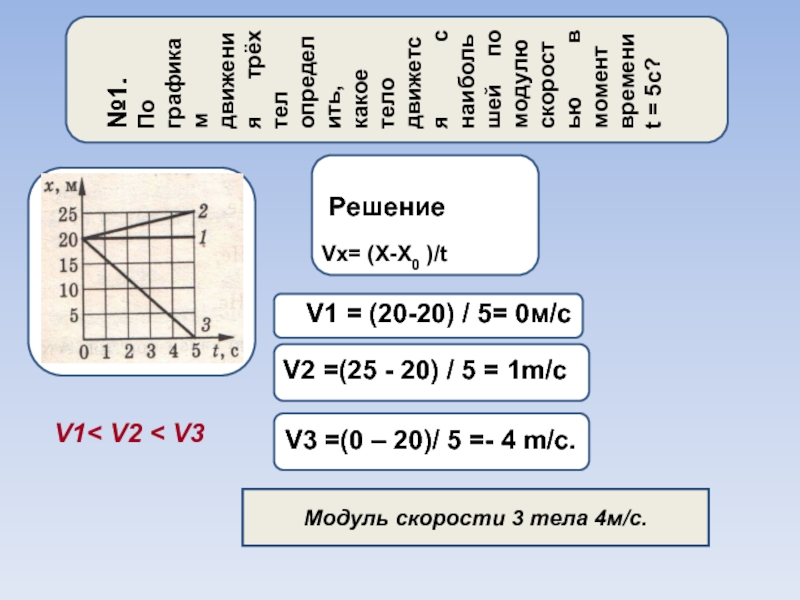 V2 =(25 - 20) / 5 = 1m/c V3 =(0 – 20)/ 5 =- 4 m/c. Vх= (X-X0 )/t Модуль скорости 3 тела 4м/с. V1< V2 < V3