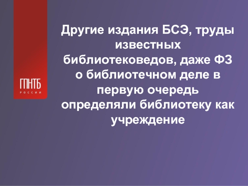 Другие издания БСЭ, труды известных библиотековедов, даже ФЗ о библиотечном деле