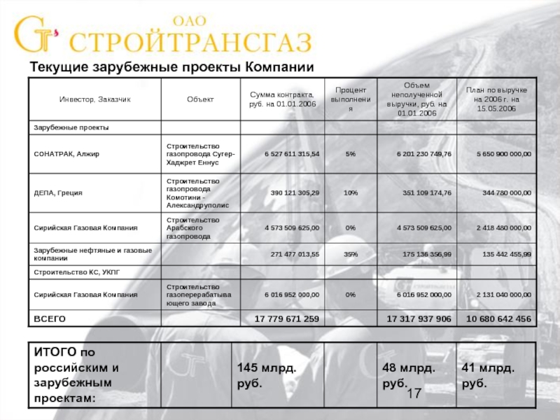 Северо-Европейский Газопровод – ОАО «Стройтрансгаз» намерен участвовать в проекте и претендует на контракт по строительству 250 – 300 км., а также до 5 – ти компрессорных станций (ориентировочный объем – 17 млрд. рублей)