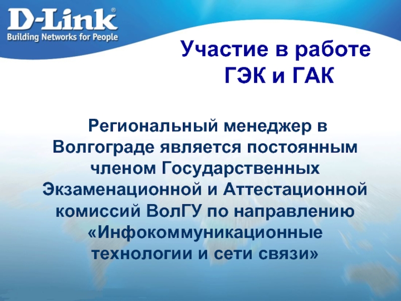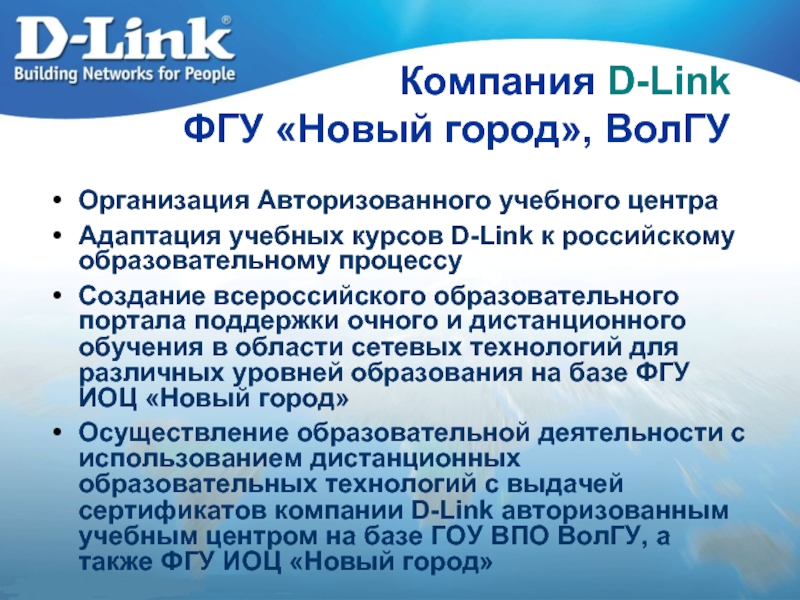 Осуществление образовательной деятельности с использованием дистанционных образовательных технологий с выдачей сертификатов компании D-Link авторизованным учебным центром на базе ГОУ ВПО ВолГУ, а также ФГУ ИОЦ «Новый город»