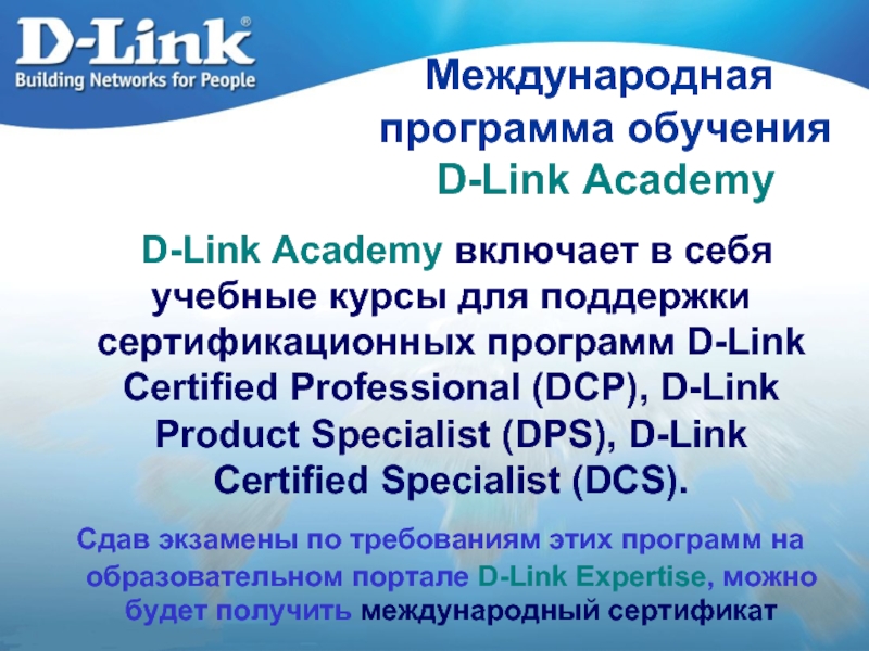 Сдав экзамены по требованиям этих программ на образовательном портале D-Link Expertise, можно будет получить международный сертификат