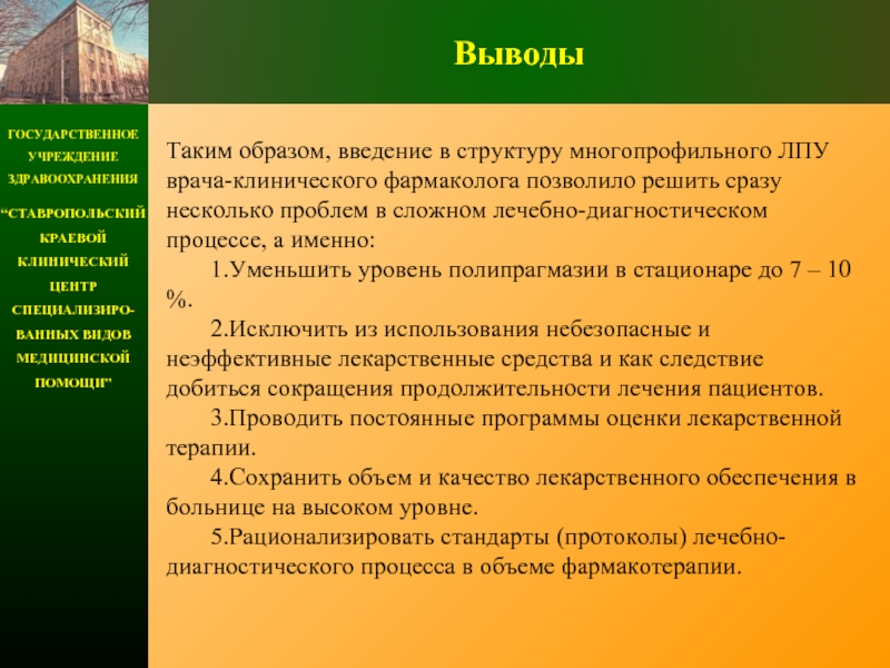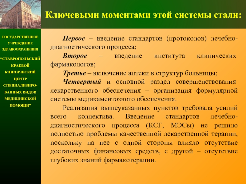 Реализация вышеуказанных пунктов требовала усилий всего коллектива. Введение стандартов лечебно-диагностического процесса (КСГ, МЭСы) не решило полностью проблемы качественной лекарственной терапии, поскольку на нее с одной стороны влияло отсутствие достаточных финансовых средств, с другой – отсутствие глубоких знаний фармакотерапии.